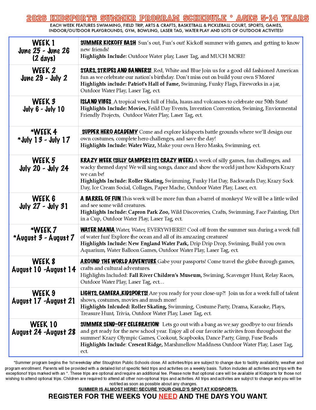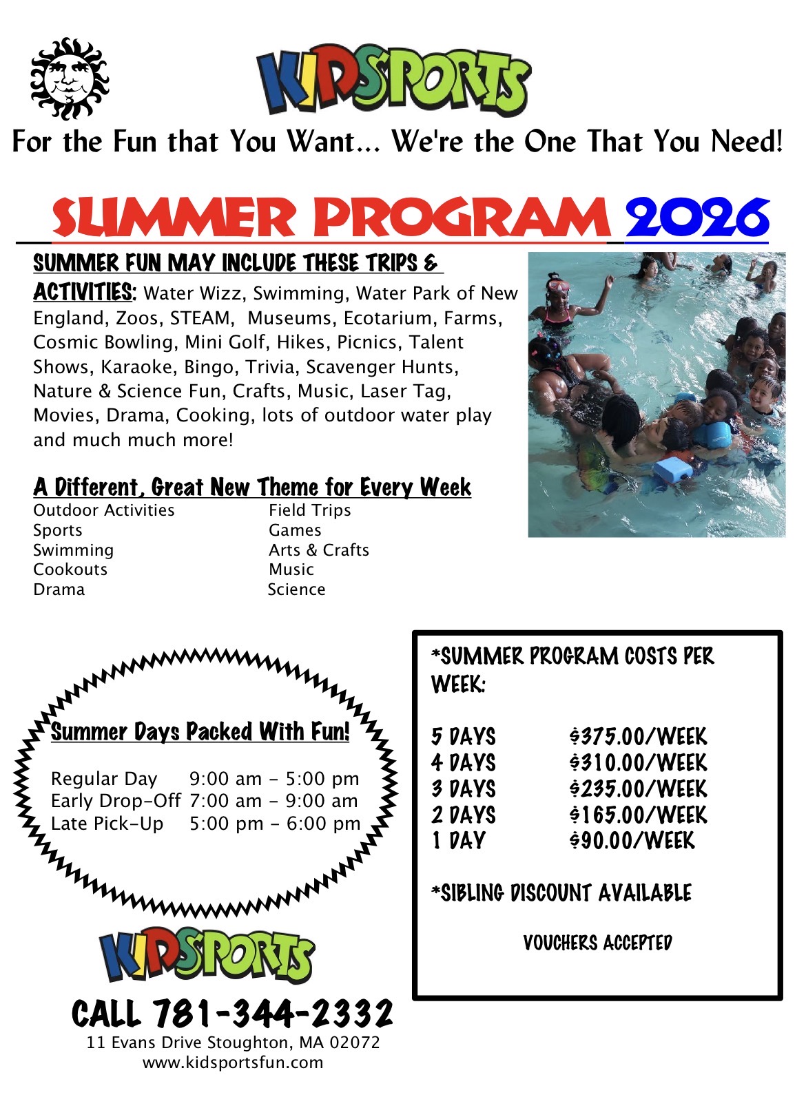 Kidsports offers an exciting summer program full of learning, adventure and fun. We begin the day after the Stoughton Public Schools close until the Friday before Labor Day.